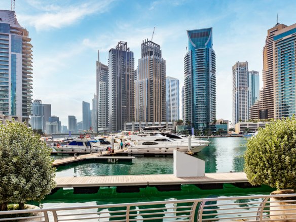White loft with dining table, chairs and dresser